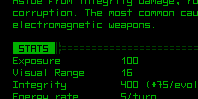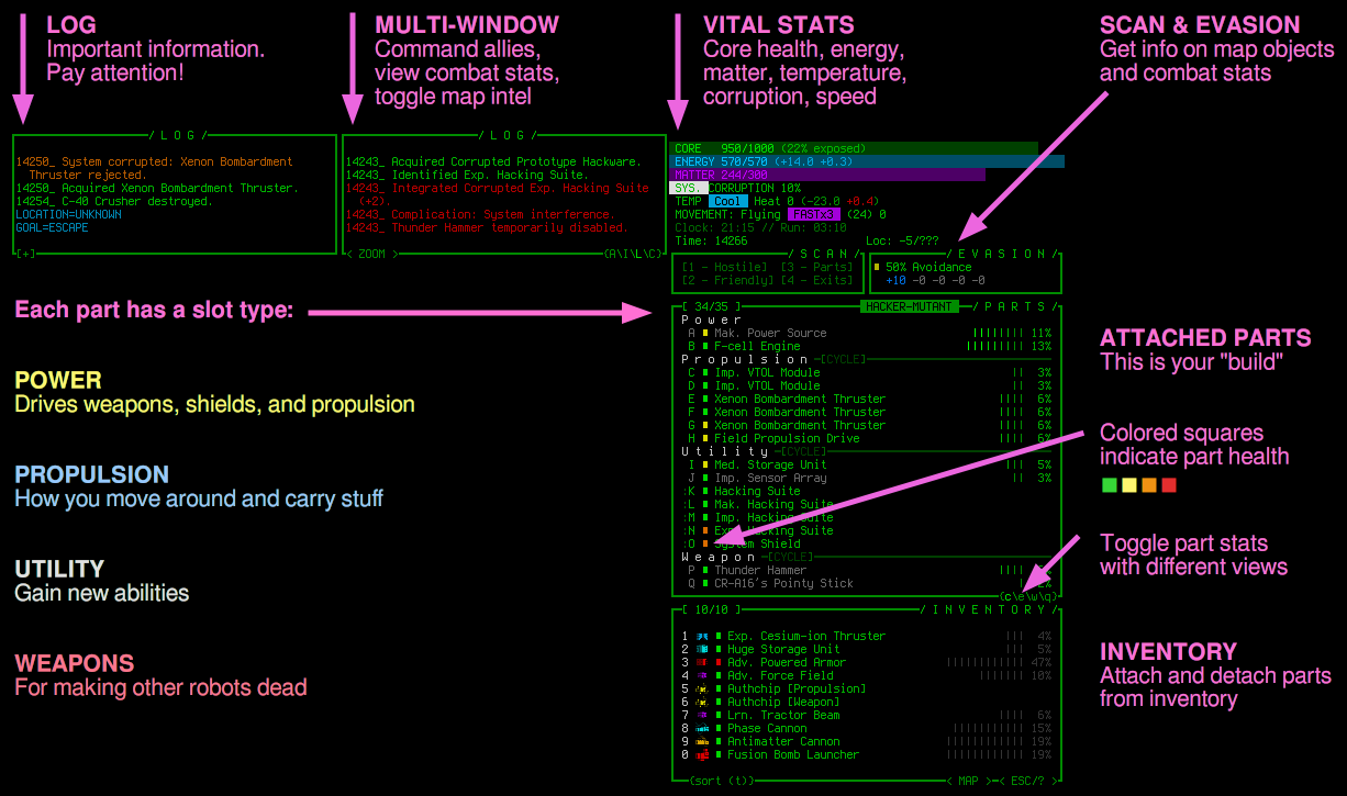 Corruption causes annoying side effects. This includes misfires, dropping parts, overheating, forgetting part IDs, etc. If you get to 100% corruption, you die. You obtain corruption from equipping corrupted parts, getting smashed by impact damage, and shot with EM damage. Corruption is reset to zero on each evolution.