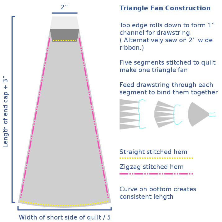Segments are sewn onto the short side of the blanket. A drawstring is fed through the channel on the end of each segment.